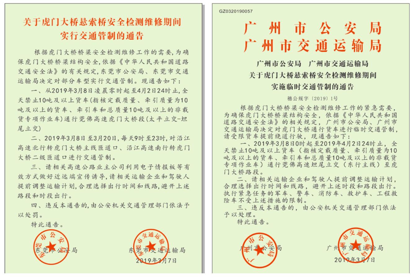 根據(jù)廣州市、東莞市兩地公安局和交通運輸局通告,從2019年3月8日0時起至4月2日24時止,全天禁止10噸及以上貨車(指核定載質(zhì)量、牽引質(zhì)量為10噸及以上的貨車、牽引車和總質(zhì)量10噸及以上的非載貨專項作業(yè)車)通行莞佛高速虎門大橋段。