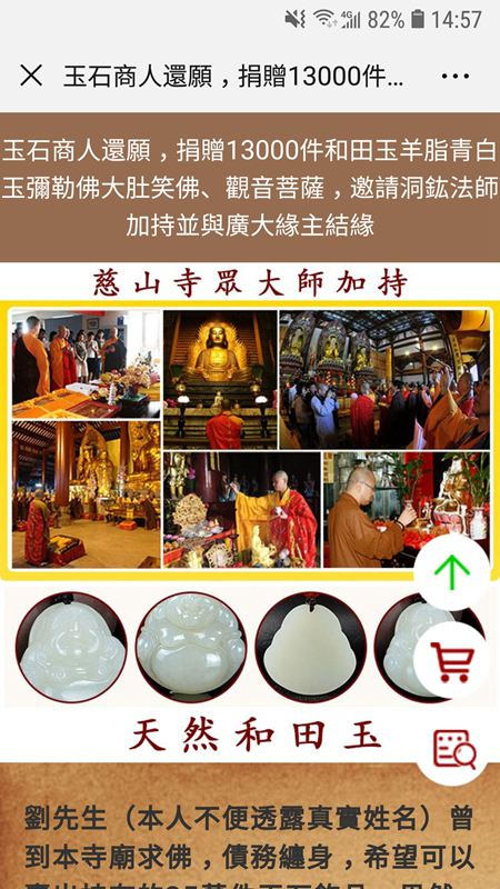 記者打開警方提供的網(wǎng)站鏈接,隨即便出現(xiàn)了香港某知名寺院的頁面,上面有不同的法師主持不同法事的照片。照片上方,赫然寫著"玉石商人還愿,捐贈13000件和田玉羊脂青白玉彌勒佛大肚笑佛、觀音菩薩,邀請 XX法師加持并與廣大緣主結(jié)緣"的字樣。接下來網(wǎng)頁上便講述了一個漏洞百出、文理不通的"傳奇故事"——