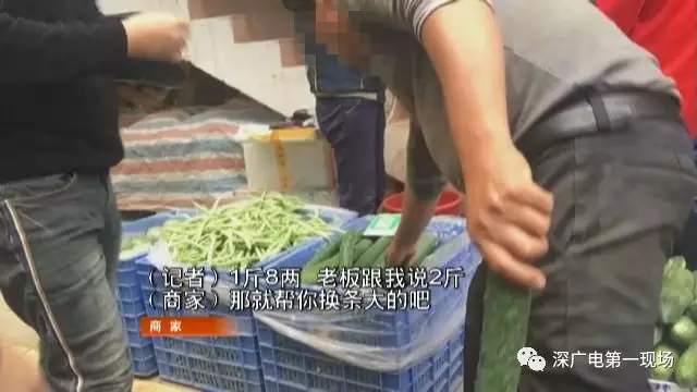 隨后,記者再次來到另外一家蔬菜攤檔,同樣選購(gòu)了兩根黃瓜,商家稱重同樣顯示的是兩斤,不過當(dāng)記者把自己的便攜秤掏出來之后,商家這回給自己變了個(gè)戲法,說要給記者換條大的。