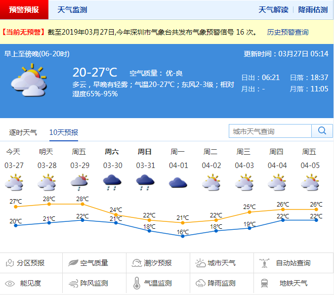 深圳新聞網(wǎng)2019年3月27日訊 深圳今日多云,早晚有輕霧;氣溫20-27℃,相對濕度65%-95%;東北風2-3級。預計28日多云間晴,氣溫繼續(xù)回升,早晚有輕霧或霧;29日多云轉(zhuǎn)雷陣雨;30-31日冷空氣影響,我市陰天有陣雨或雷陣雨,日溫差小,天氣明顯轉(zhuǎn)涼;4月1日陰天轉(zhuǎn)多云,偶有零星小雨。