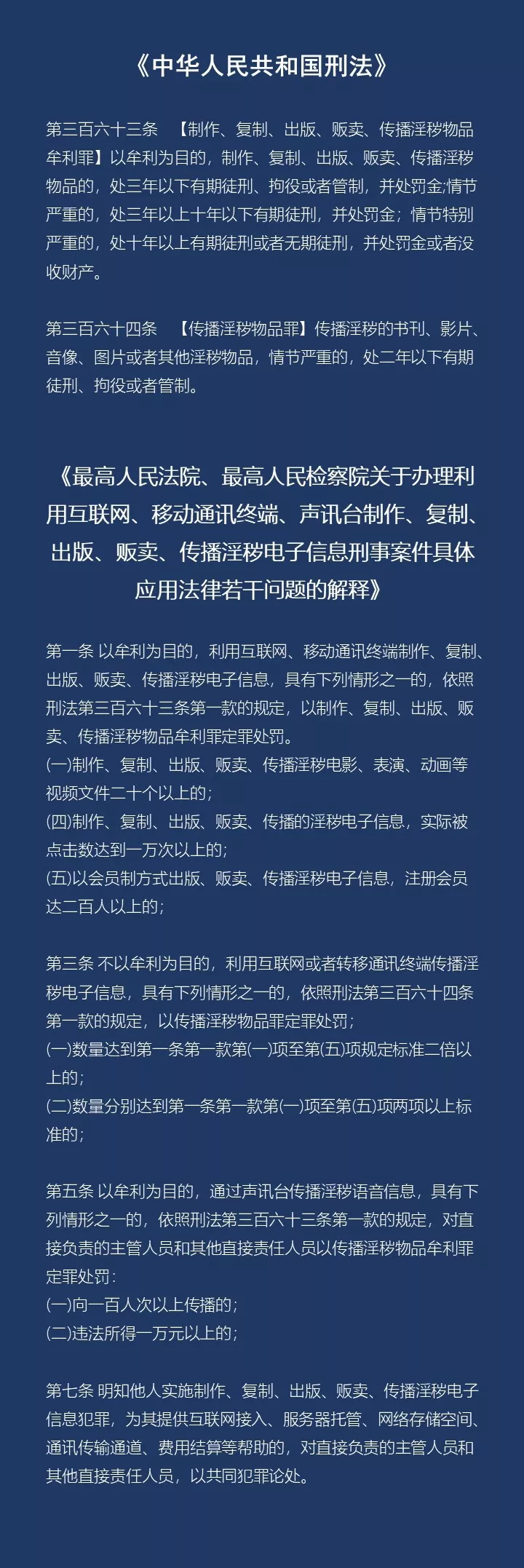 我國《刑法》規(guī)定了對傳播淫穢物品牟利罪、傳播淫穢物品罪的處罰,而最高法、最高檢2004年9月出臺的《關(guān)于辦理利用互聯(lián)網(wǎng)、移動通信終端、聲訊臺制作、復(fù)制、出版、販賣、傳播淫穢電子信息的刑事案件具體應(yīng)用法律若干問題的解釋》,又對此類犯罪認定做了詳細的解釋。