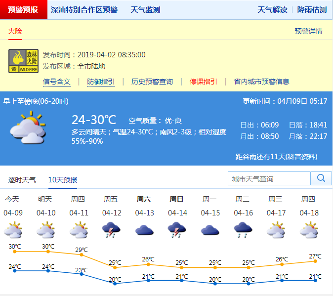 深圳新聞網(wǎng)2019年4月9日訊(記者 陳婕)昨天(8日)東門氣溫已經(jīng)率先突破31℃,全市大部地區(qū)氣溫也在28℃以上了,預計暖濕天氣還會持續(xù)。深圳國家基準站記錄到最高氣溫29.7℃,為今年以來最高氣溫;相對濕度75%-95%;偏南風2-3級;能見度3-20公里?;痣U預警信號生效中。至于網(wǎng)友們關(guān)心的深圳什么時候入夏的問題,小記了解到,深圳平均入夏時間為4月21日,大家還是安心坐等夏天吧。
