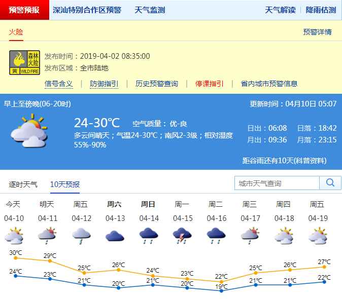 深圳新聞網(wǎng)2019年4月10日訊 超過30℃!深圳昨日氣溫創(chuàng)下2019年以來最高。記者從深圳市氣象局了解到,今日深圳市以多云間晴天天氣為主;氣溫在24-30℃;南風(fēng)2-3級(jí);相對(duì)濕度55%-90%。