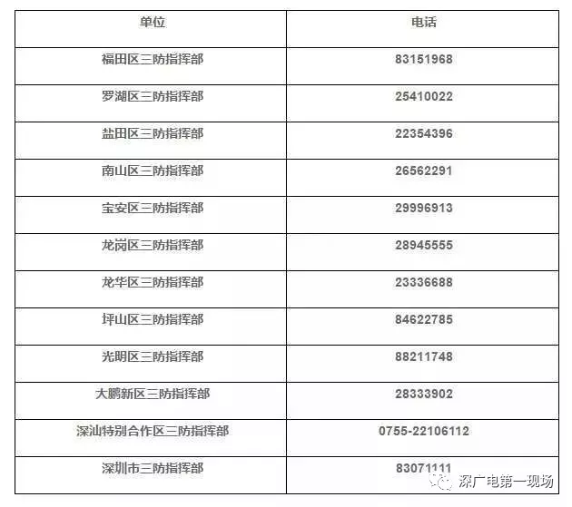 深圳市、區(qū)三防指揮部報災(zāi)電話