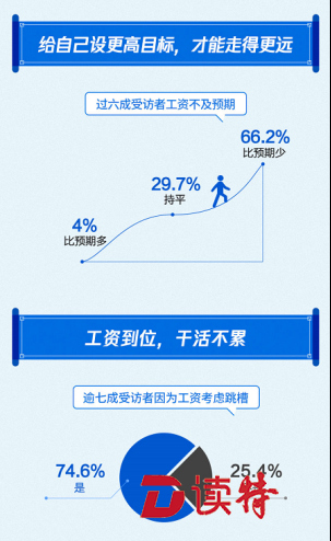 報告顯示,受經(jīng)濟環(huán)境等因素影響,過六成受訪者工資不及預(yù)期,同時,工資水平影響了職場人的職業(yè)規(guī)劃,逾七成受訪者因為工資考慮跳槽;66.2%的受訪者工資水平比預(yù)期少,只有4%的受訪者認(rèn)為工資比預(yù)期多,此外,逾七成受訪者認(rèn)為工資是考慮跳槽的主要因素。