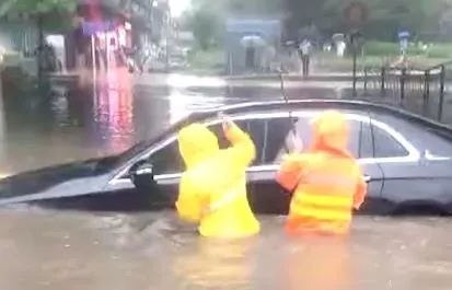 視頻中,一名外賣小哥和一名環(huán)衛(wèi)工正在砸車窗,此時車已經淹沒在水中,快漫上車窗。記者了解到,該視頻發(fā)生在上周末,深圳暴雨中一名開著奔馳車的司機被困路上,已經出現(xiàn)缺氧情況,幸得路過的外賣小哥出手救人。