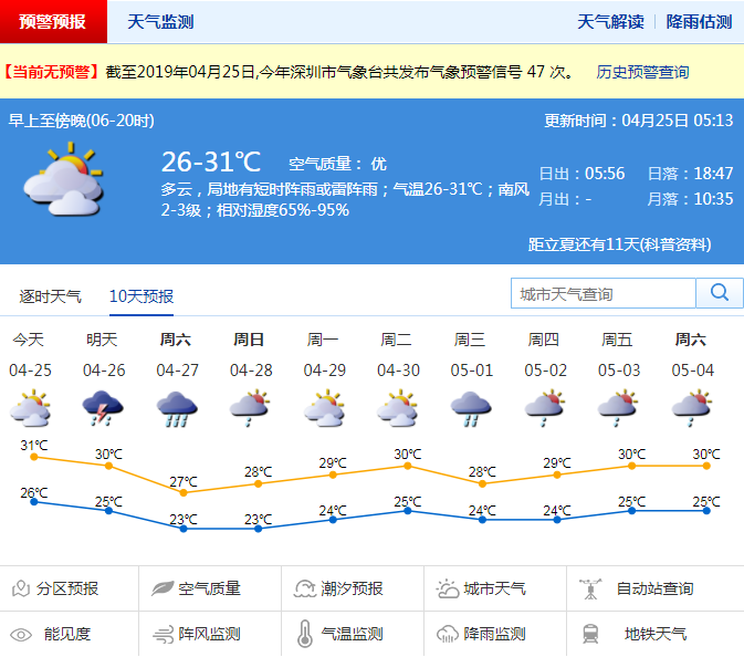 深圳新聞網(wǎng)2019年4月25日訊 本周以來,陽光充足,氣溫逐日上升,不過隨著“五一”假期的臨近,強降雨也在悄悄靠近。據(jù)市氣象臺預(yù)測,25日我市多云,中午前后炎熱,有短時陣雨或雷陣雨,早晚東部有大霧。26-27日有大雨到暴雨,伴短時強降水、8級左右短時大風(fēng)和雷暴。28-30日降雨減弱,有陣雨或雷陣雨;展望“五一”假期前期還有一次強降雨過程。