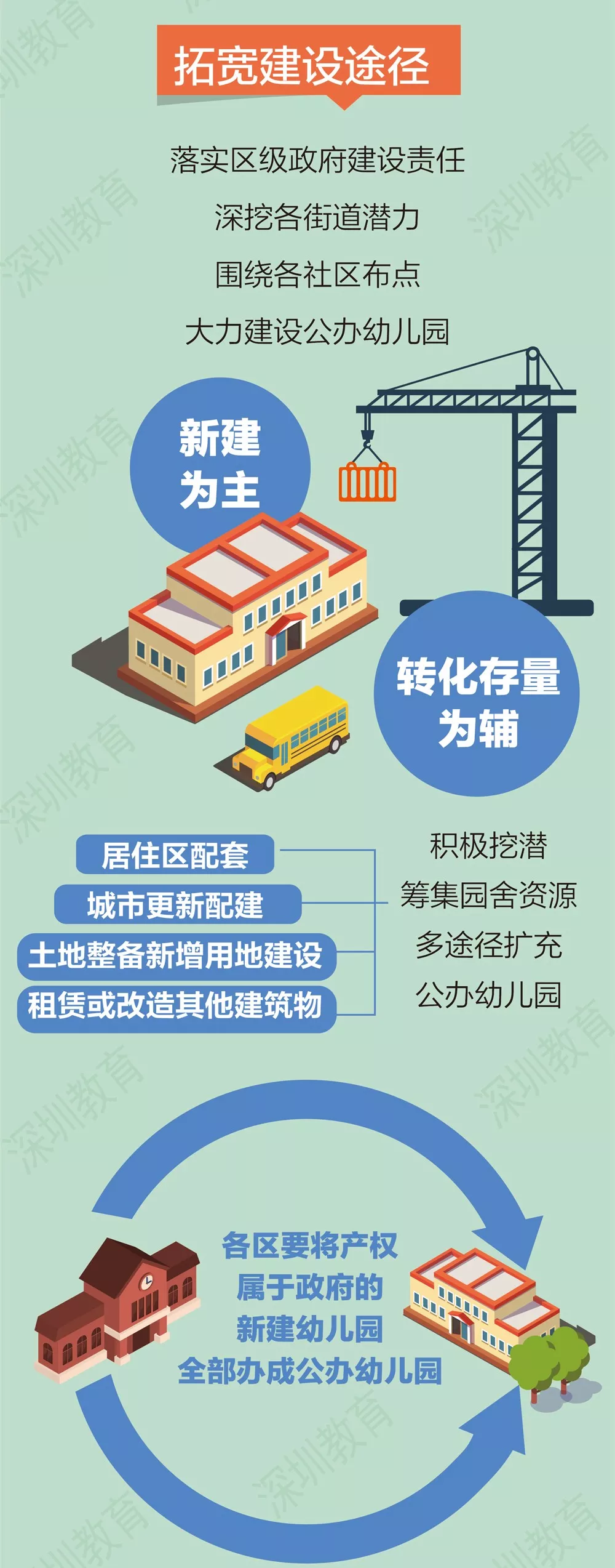 深圳公辦園建設(shè)策略將以市政府主導(dǎo)統(tǒng)籌推進(jìn)動,各區(qū)政府履行主體責(zé)任,挖掘各街道潛力,圍繞各社區(qū)布點,力爭每個社區(qū)有1-2所公辦園,每年新建2萬個以上學(xué)前教育學(xué)位。加大幼兒園規(guī)劃與建設(shè)力度,鼓勵社會力量興辦幼兒園和其他類型學(xué)前教育機構(gòu)。