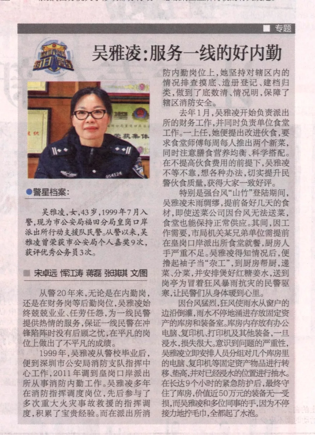 1999年,吳雅凌從警校畢業(yè)后,便到深圳市公安局消防支隊指揮中心工作,2011年調(diào)到皇崗口岸派出所從事消防內(nèi)勤工作。吳雅凌多年駐扎在消防指揮調(diào)度崗位,先后參與了多次重大火災(zāi)事故救援的指揮調(diào)度,積累了寶貴經(jīng)驗。而在派出所消防內(nèi)勤崗位上,她堅持對轄區(qū)內(nèi)的情況排查摸底、造冊登記、建檔歸類,做到了底數(shù)清、情況明,保障了轄區(qū)消防安全。