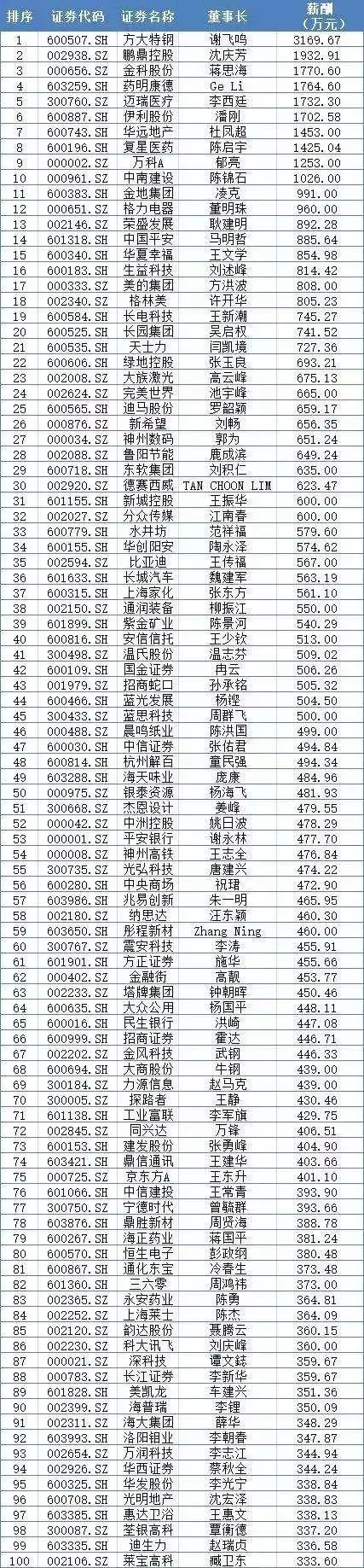 2018年A股上市公司董事長年薪在500萬以上的有44位,1000萬以上的有10位。其中,2018年A股上市公司薪酬最高的為方大特鋼董事長謝飛鳴,年薪為3169.67萬元。萊寶高科董事長以333.60正好躋身第100名。