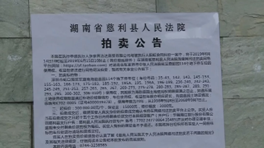 公告說(shuō),將強(qiáng)制拍賣114個(gè)停車位,網(wǎng)上拍賣時(shí)間是2019年6月14日至6月15日,落款是湖南省慈利縣人民法院。
