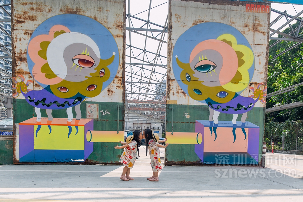 在城市公共空間中,涂鴉藝術(shù)不僅是一種重要的人文景觀,同時還能給人一種視覺享受,使單一的生活變得富有色彩。來自中國香港的全職藝術(shù)家彭怡擅長用涂鴉進(jìn)行故事創(chuàng)作,帶來作品《雙觀》,以左右對稱相望的停車場守護(hù)神的形象感染車主與行人,傳達(dá)平穩(wěn)冷靜的力量。
