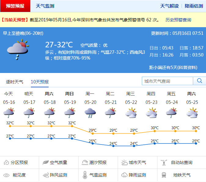 深圳新聞網(wǎng)2019年5月16日訊 本周深圳天氣持續(xù)炎熱,市民中心站最高氣溫甚至超過(guò)35℃。記者從市氣象局了解到,16日至19日天氣炎熱,最高氣溫達(dá)32℃,以多云為主,多局地性(雷)陣雨;19日夜間至20日有一次明顯降雨并伴有雷雨大風(fēng)。