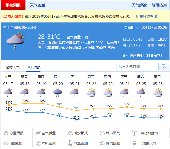 深圳新聞網(wǎng)2019年5月17日訊 近幾日深圳天氣悶熱,17日白天氣溫在28~31℃之間,預(yù)計(jì)18~19日深圳多局地性短時(shí)(雷)陣雨,天氣悶熱,20日有一次中到大雨局部暴雨的降雨過程。據(jù)悉,深圳將進(jìn)入龍舟水強(qiáng)降水集中期,預(yù)計(jì)今年深圳龍舟水偏重。