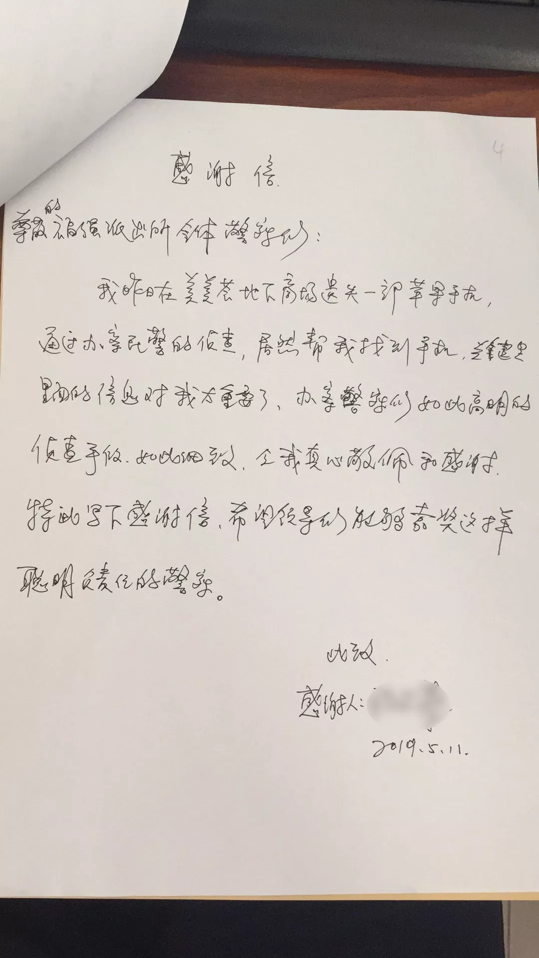 “手機(jī)里面的信息太重要了,辦案警察們?nèi)绱烁呙鞯膫刹槭侄危绱思?xì)致,令我真心敬佩和感謝!”5月11日晚,程女士在福強(qiáng)派出所的前臺(tái)激動(dòng)地手寫了這封感謝信。