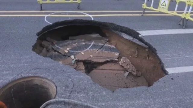 記者在現(xiàn)場看到,海德一道靠近后海濱路的道路中間形成了一個大坑, 坑內(nèi)還有不少污水,發(fā)出陣陣惡臭味 。