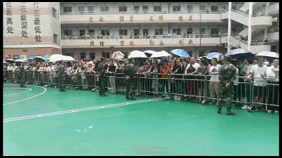 當(dāng)天在蜂擁的人群中,有一個人在家長群里火了,視頻里他身穿警服,拿著喇叭在現(xiàn)場維持秩序。