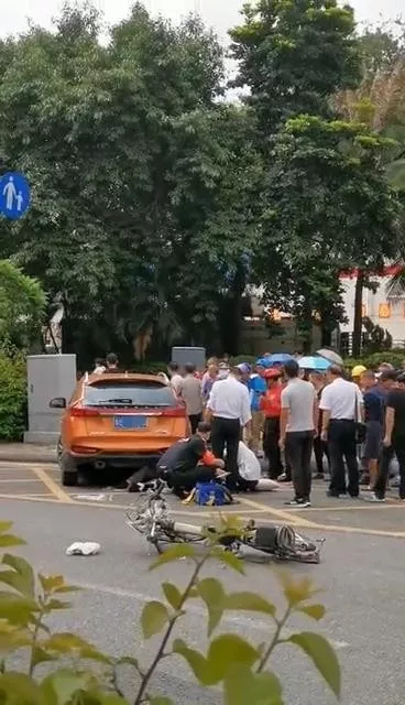 現(xiàn)場(chǎng)可以看到。橙色SUV已經(jīng)停在路邊。車旁是一輛被撞翻的電單車,救護(hù)車到達(dá)現(xiàn)場(chǎng)后,迅速對(duì)男子實(shí)施搶救。