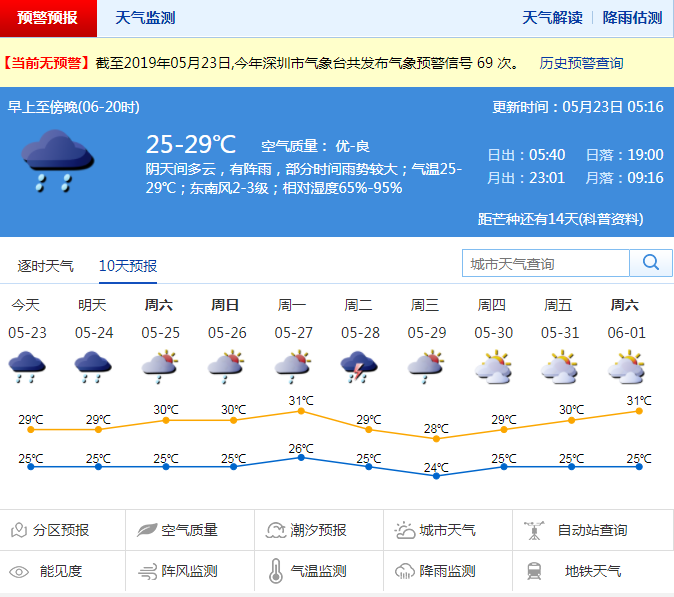 深圳新聞網(wǎng)2019年5月23日訊 21日夜間至22日白天,寶安、光明和南山出現(xiàn)大雨,其他地區(qū)出現(xiàn)小雨。預(yù)計今明兩日我市陰天到多云,有中到大雨,局部暴雨;25-27日多云為主,有短時陣雨或雷陣雨;28日有雷陣雨;29日多云有短時陣雨。
