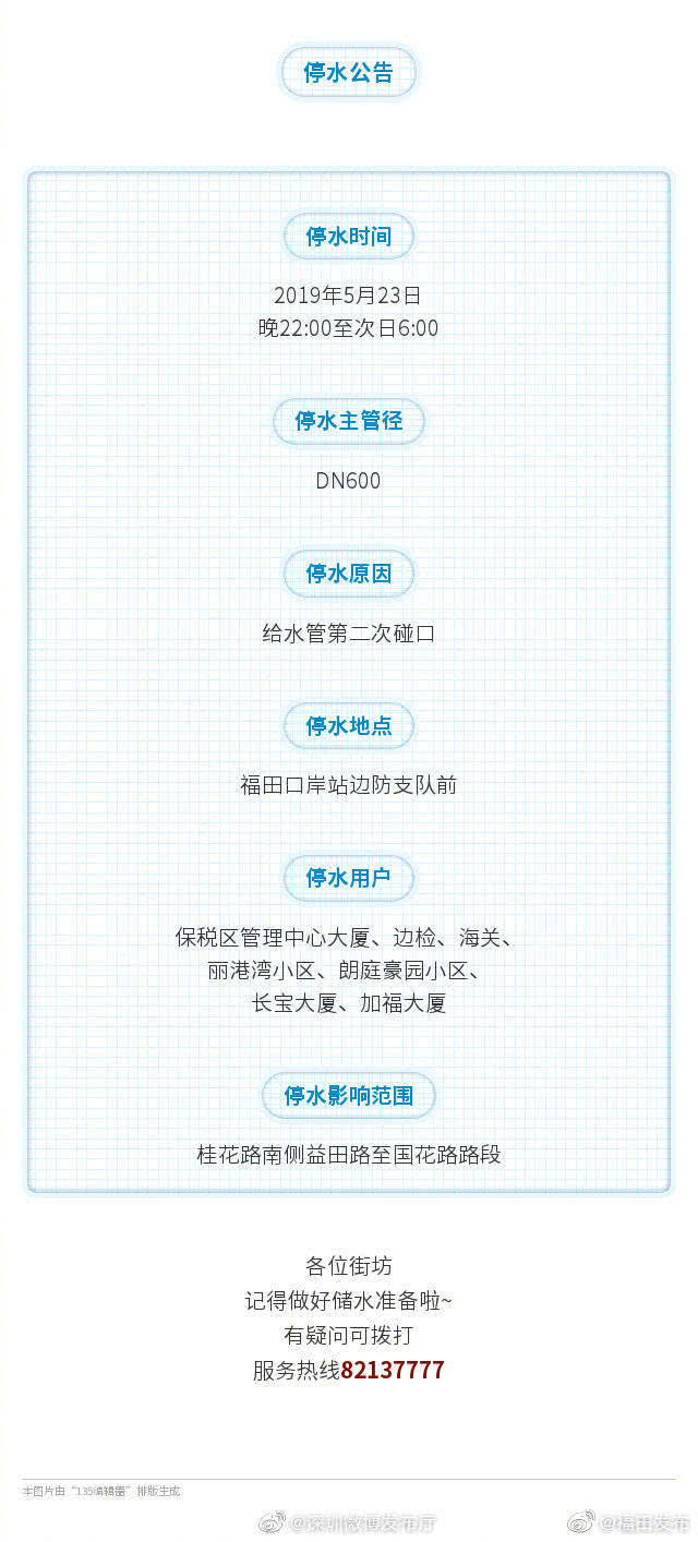 溫馨提醒!今天晚上22:00至明日6:00,福田區(qū)保稅區(qū)管理中心大廈、邊檢、海關、麗港灣小區(qū)、朗庭豪園小區(qū)、長寶大廈、加福大廈等區(qū)域?qū)⒂媱澩K?,各位街坊記得做好儲水準備??!戳下圖了解更多停水停電資訊!