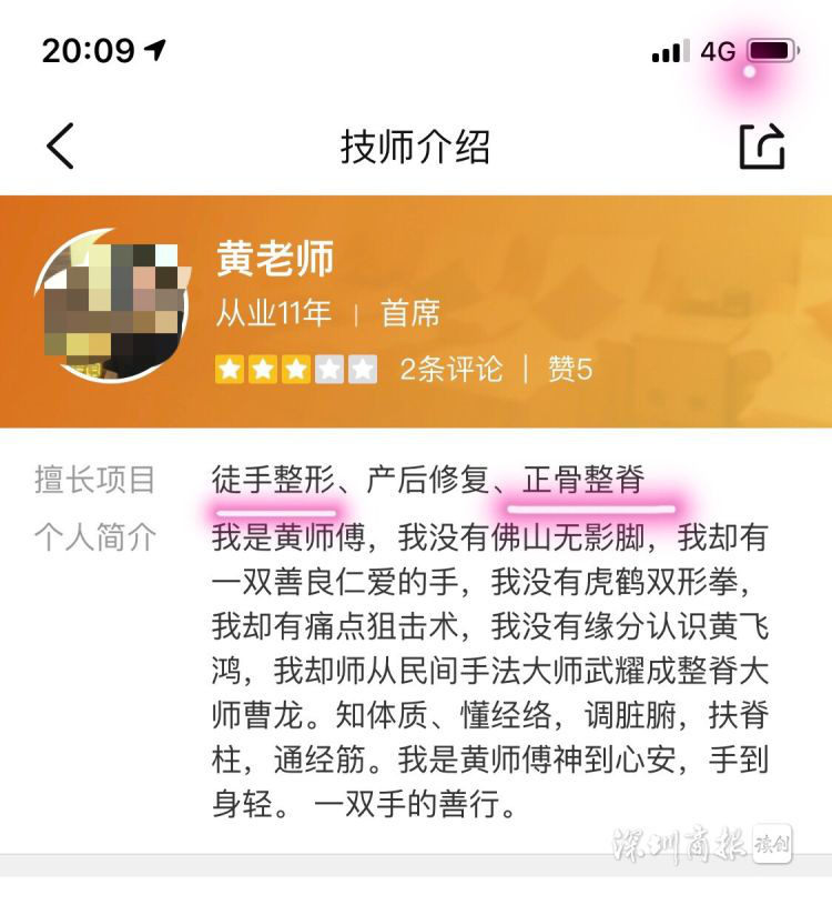 涉事黃師傅在美團(tuán)上介紹顯示為首席技師,其從業(yè)11年,擅長項(xiàng)目為徒手整形、產(chǎn)后修復(fù)、正骨整脊。值得注意的是,該店在美團(tuán)上評(píng)價(jià)為五星滿分。