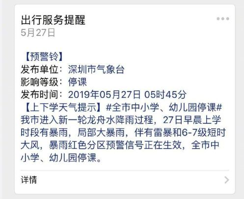 5月27日5時45分,深圳天氣微信公眾號發(fā)布出行服務(wù)提醒:深圳進(jìn)入新一輪龍舟水降雨過程,27日早晨上學(xué)時段有暴雨,局部大暴雨,暴雨紅色預(yù)警信號正在生效全市中小學(xué)、幼兒園停課。