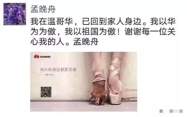 當(dāng)?shù)貢r(shí)間2018年12月1日,加拿大當(dāng)局應(yīng)美方要求,扣留了在加拿大機(jī)場轉(zhuǎn)機(jī)的孟晚舟,美國隨后承認(rèn),正在尋求對(duì)孟晚舟的引渡。10天之后,2018年12月11日,加拿大法院作出裁決,批準(zhǔn)孟晚舟的保釋申請。當(dāng)晚,走出法庭的孟晚舟發(fā)朋友圈表示,我以華為為傲,我以祖國為傲。配圖就是那張“芭蕾腳”的華為廣告圖,上面寫著:偉大的背后都是苦難。外界擔(dān)心,由于不斷升級(jí)的中美貿(mào)易摩擦,可能會(huì)影響到孟晚舟在加拿大的引渡訴訟。