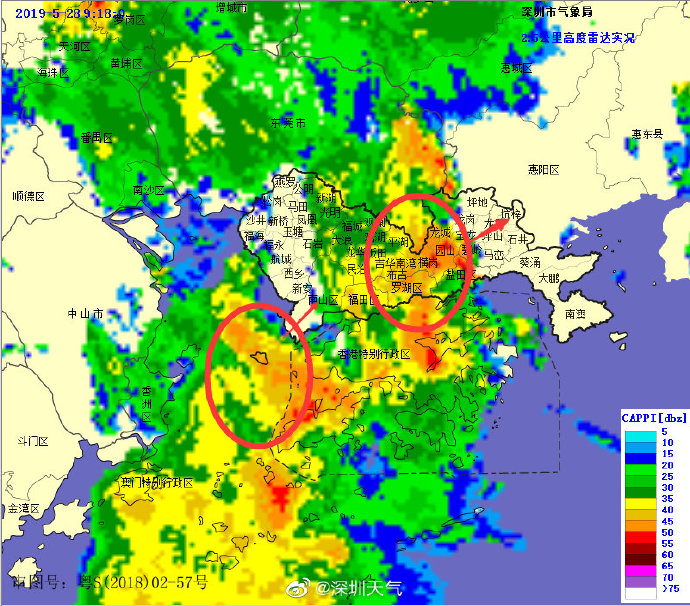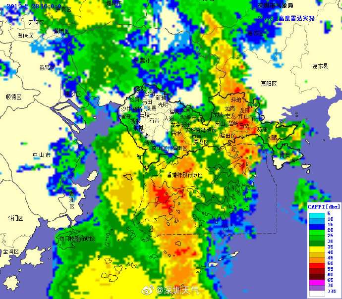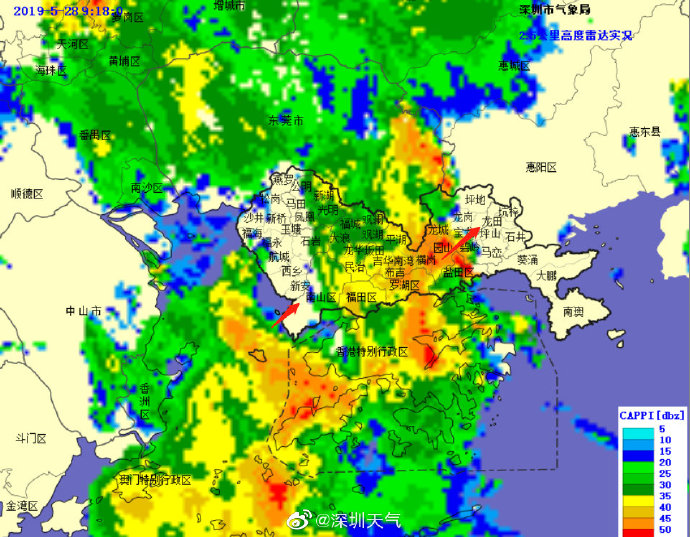 目前強降水中心已移至我市中部地區(qū),未來1-2小時內(nèi)東部地區(qū)將出現(xiàn)20-40毫米降水,深圳市氣象臺于2019年05月28日09時15分將暴雨黃色預警擴展至全市,全市進入暴雨戒備狀態(tài),請注意防范。