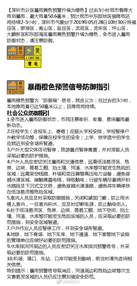 【三防信息】市氣象局已于5月28日10時30分在發(fā)布暴雨橙色分區(qū)預警信號。目前降雨持續(xù),局部地區(qū)雨勢較大,為切實做好全市各項防御工作,及時應對險情災情,根據(jù)《深圳市防汛應急預案》,市三防指揮部決定于5月28日10時30分啟動防汛Ⅳ級應急響應。
