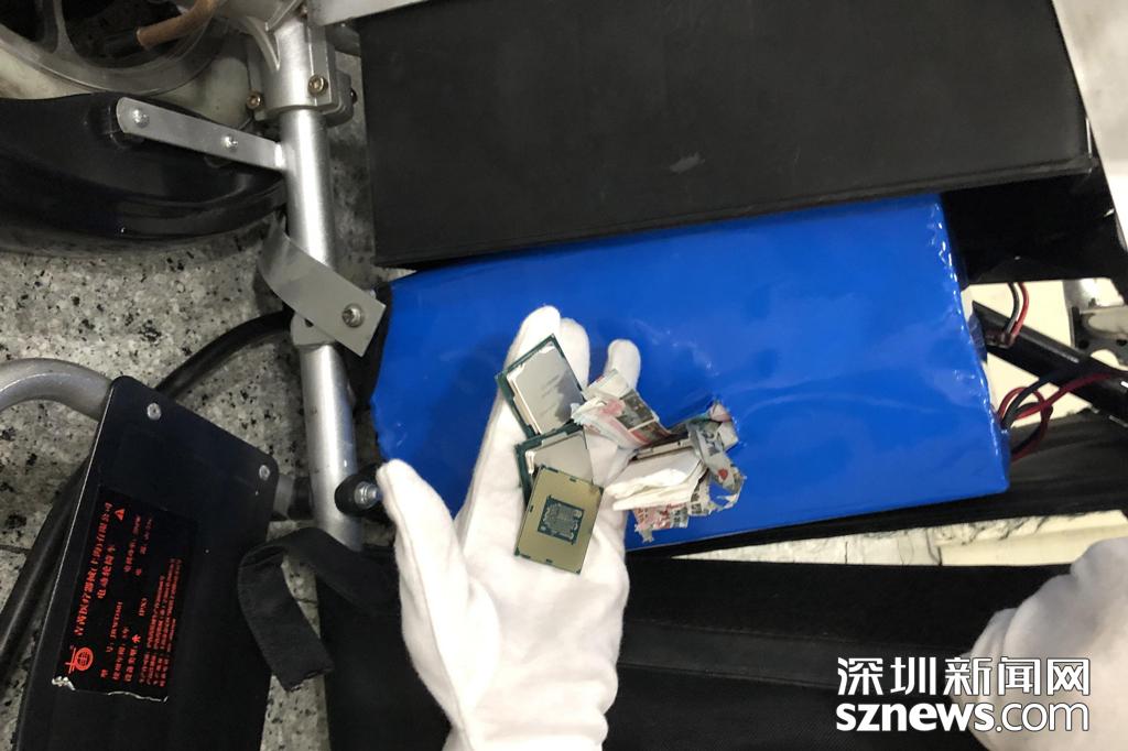 5月22日上午,在福田口岸入境大廳,一名60歲左右乘坐在電動輪椅上的女性旅客經(jīng)過海關(guān)監(jiān)管通道。據(jù)當值關(guān)員介紹,該女子行李不多,輪椅上只有一些空背包和空袋子。隨后,海關(guān)關(guān)員對其攜帶物品及輪椅進行檢查,發(fā)現(xiàn)輪椅底部的電池盒有異常,存在夾藏嫌疑。在拆解輪椅電池盒后,關(guān)員發(fā)現(xiàn)電池盒內(nèi)整整齊齊疊放著一批散裝CPU。經(jīng)清點,共查獲INTEL各型號 CPU898塊。關(guān)員調(diào)查發(fā)現(xiàn),當事人持有殘疾人證件,并承認此次為幫人帶貨,收取了300元“帶工費”。