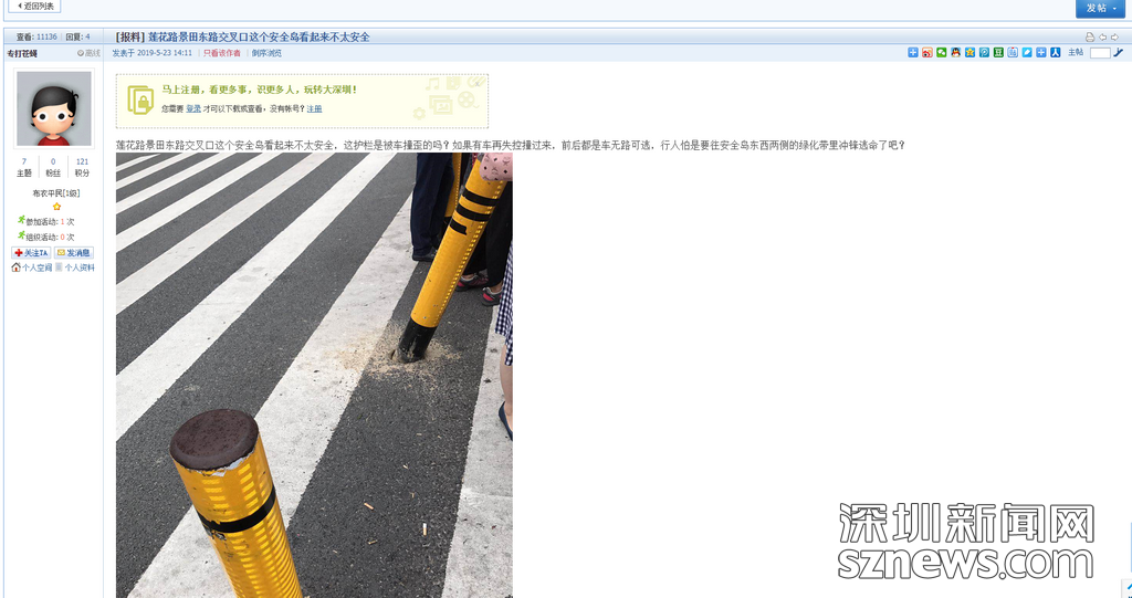 深圳新聞網(wǎng)2019年5月29日訊(記者 劉婷)“蓮花路景田東路交叉口這個(gè)安全島看起來(lái)不太安全?!苯眨W(wǎng)友“專打蒼蠅”在深圳論壇爆料稱,蓮花路景田東路交叉口安全島警示樁受損,存在安全隱患。5月29日,記者來(lái)到該路段實(shí)地勘察,發(fā)現(xiàn)安全島受損警示樁已全部整改。 (原帖文:蓮花路景田東路交叉口這個(gè)安全島看起來(lái)不太安全)