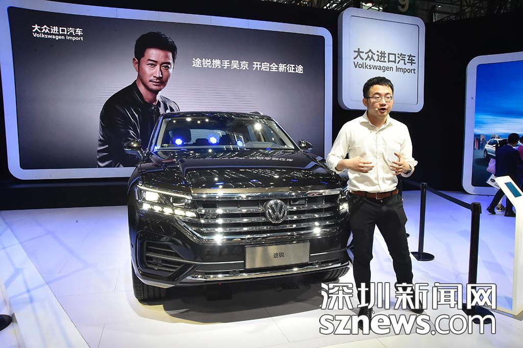 大眾汽車講解員向市民介紹途銳的特點(diǎn)