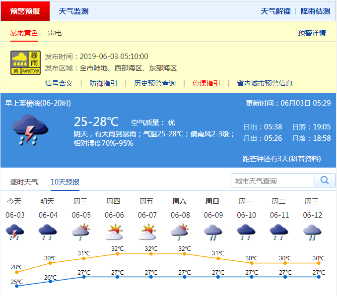 【上班天氣】預(yù)計早晨6-9時,全市陰天,有大雨到暴雨;氣溫25-27℃;偏南風(fēng)2-3級,雨時最大陣風(fēng)6-7級;相對濕度85%-100%;全市能見度3-10公里,雨時能見度較差,注意交通安全;降雨時間長,請合理做好出行安排。深圳市氣象臺2019年06月03日05:39發(fā)布。