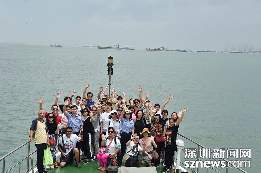 登船市民與海監(jiān)員在船頭合影留念