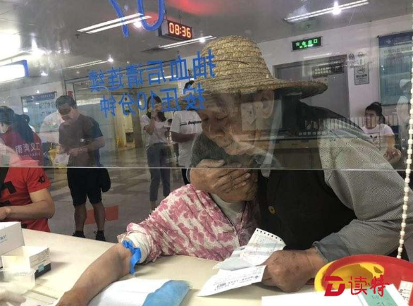 一名七旬老人陪老伴抽血檢查時,因?yàn)閾?dān)心其暈血,老人貼心地?fù)肀Ю习?,還捂住其眼睛不讓其看抽血。