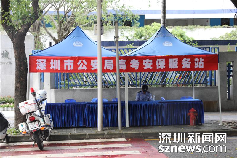 在深圳實(shí)驗(yàn)中學(xué)中學(xué)部考點(diǎn)外,深圳市公安局設(shè)置有高考安保服務(wù)站