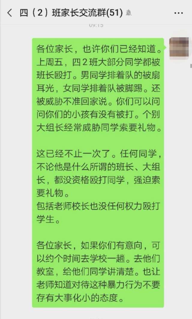 據(jù)女兒反映,當(dāng)天上午課間時(shí)分,班長(zhǎng)(女)將班上的學(xué)生集合在一起,以違反紀(jì)律為由要體罰他們。“三十多名學(xué)生排著隊(duì)被班長(zhǎng)毆打,男生被扇耳光,女生被腳踢?!?/p>