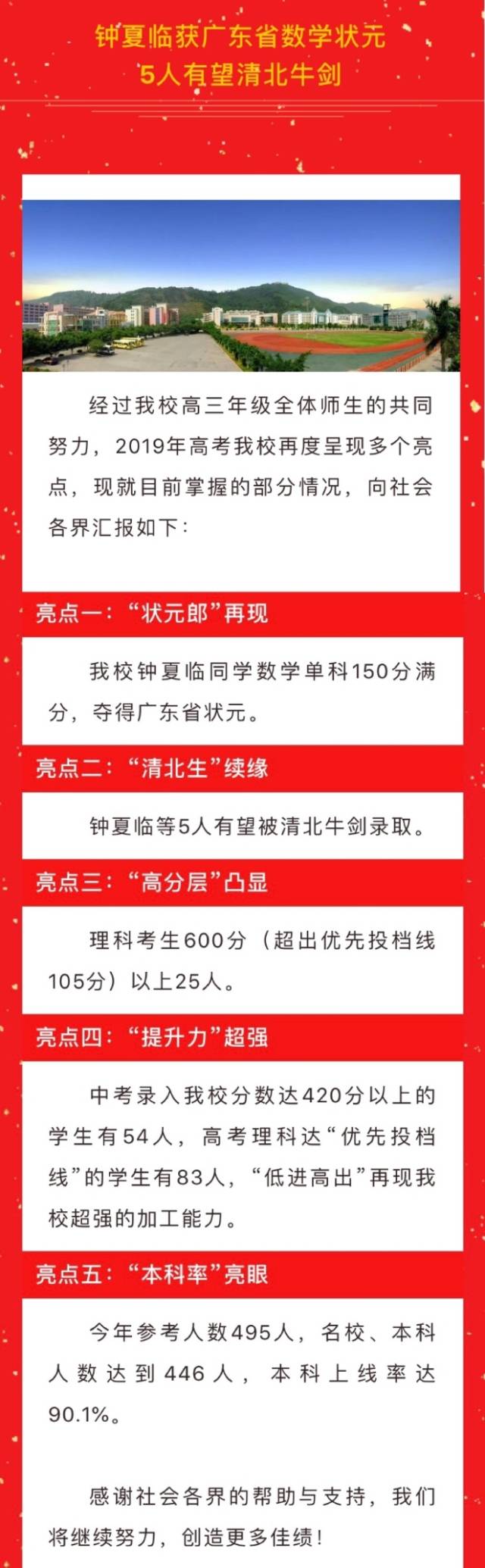 學(xué)校稱其2019年高?!案叻謱印蓖癸@,理科考生600分(超出優(yōu)先投檔線105分)以上25人;“本科率”亮眼,今年參考人數(shù)495人,名校、本科人數(shù)達到446人,本科上線率達90.1%;此外,還提到“提升力”,稱中考錄入該校分數(shù)達420分以上的學(xué)生有54人,高考理科達“優(yōu)先投檔線”的學(xué)生有83人,實現(xiàn)“低進高出”。