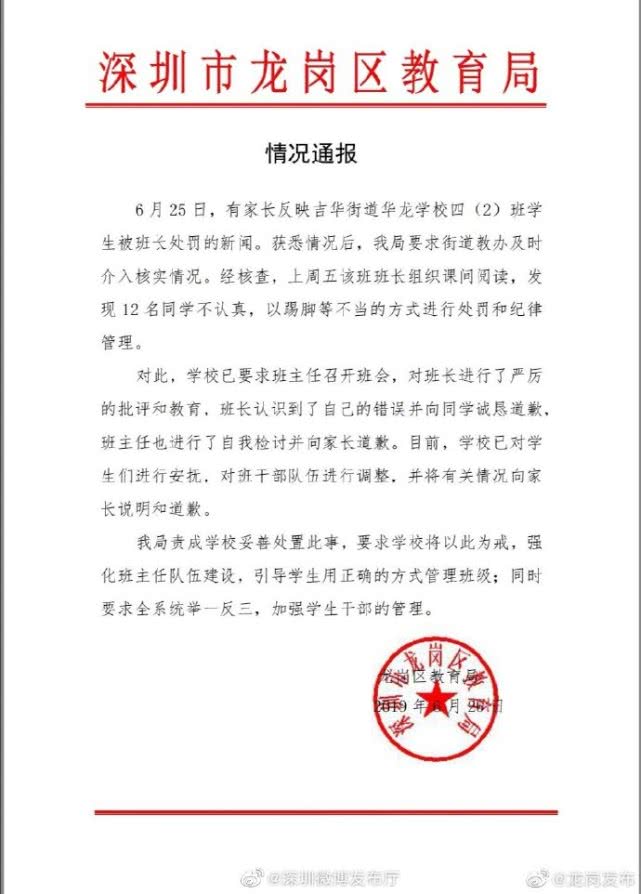 深圳新聞網(wǎng)2019年6月26日訊 近日,關于深圳一小學班長對同學拳打腳踢的輿情網(wǎng)上熱傳?記者26日從龍崗區(qū)教育局獲悉,該班班長確實對12名學生以踢腳等不當方式進行紀律管理。事情發(fā)生后,學校已對該班班長進行了嚴厲的批評教育,該班班主任也進行自我檢討和道歉。目前,學校已對學生進行安撫,對班干部隊伍進行了調(diào)整。
