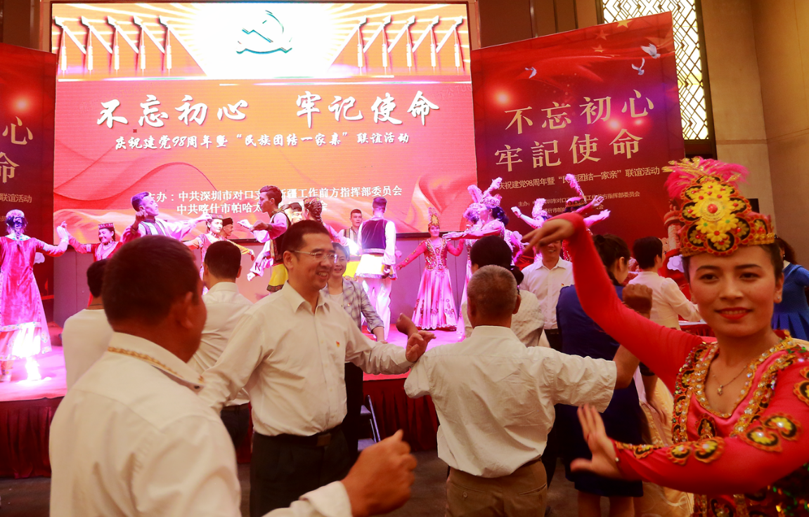 深圳新聞網(wǎng)2019年7月1日訊 盛夏七月,紅色黨旗迎風(fēng)飄,為積極響應(yīng)黨中央關(guān)于在全黨開展“不忘初心牢記使命”主題教育的重大部署。6月30日,深圳援疆前方指揮部、中共喀什市帕哈太克里鄉(xiāng)委員會(huì)聯(lián)合組織開展慶祝建黨98周年暨“民族團(tuán)結(jié)一家親聯(lián)誼”活動(dòng)??κ驳貐^(qū)行署領(lǐng)導(dǎo)、全體援疆干部人才、帕哈太克里鄉(xiāng)結(jié)親群眾等300余人參與活動(dòng)。