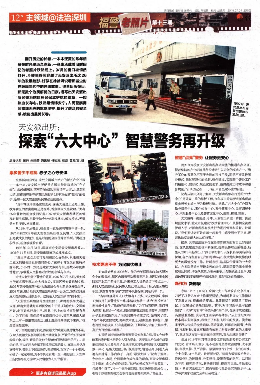 新作為新愿景今年5月7日至8日,全國公安工作會議在北京召開,習(xí)近平總書記在會上作重要講話,為新時期公安工作指明了發(fā)展方向,提出新的要求。此番講話引起所里廣泛熱議,引發(fā)警員們的熱烈反響。其中,對于習(xí)近平總書記提出的“十六字”方針中“科技興警”四個字,合成作戰(zhàn)室主任高強滿腹感慨,表示對這四字深有體會?!皬纳鲜兰o90年代本科畢業(yè)到現(xiàn)在,我經(jīng)歷了科技飛躍式的發(fā)展。偵查破案手段從傳統(tǒng)的步法追蹤、筆跡鑒定,到現(xiàn)在的網(wǎng)警、大數(shù)據(jù)、視頻科技,破案更精準有效率,‘科技興警’真的太重要了,深圳在這方面一直走在全國前列,我為此感到自豪!”