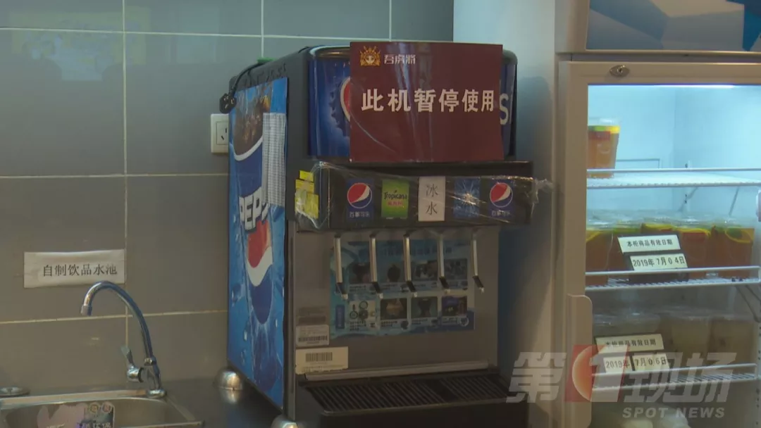 今天中午,記者跟隨轄區(qū)市監(jiān)所執(zhí)法人員來到涉事門店現(xiàn)場檢查。據(jù)了解,2號事發(fā)后,店里的這臺飲料機(jī)已經(jīng)暫停使用,目前飲料出口是用保鮮膜封住的。店方稱,飲料機(jī),每個(gè)月由百事可樂廠家人員深層清洗一次,他們的員工是每天對飲料機(jī)的糖漿管道和濾嘴進(jìn)行清洗,都有清洗記錄。