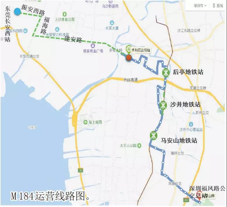 途經道路包括:福鳳路、鳳凰山大道、鳳凰立交、鳳塘大道、中心路、南環(huán)路、寶安大道、新和大道、沙松路、北亭路、大埔北路、大埔中路、新和大道、沙井路、向興路、大興一路、新和大道、建安路、福海路、振安西路。