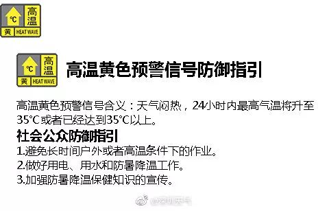 深圳市氣象臺(tái)于2019年07月15日08時(shí)在全市陸地發(fā)布高溫黃色預(yù)警,目前高溫預(yù)警信號(hào)生效中,信號(hào)可能持續(xù)3天左右,白天天氣酷熱,大家要做好防暑降溫工作,避免長(zhǎng)時(shí)間戶外或者高溫條件下的作業(yè)。