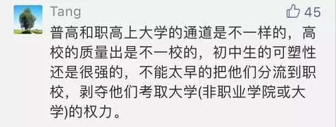 有網友表示:十四五歲的孩子行知尚未成熟,未成年少年無法在中考結束后就確定職業(yè),職業(yè)學校應該在高中學業(yè)結束后滿18歲的孩子再考慮。中學階段搞職業(yè)教育有點操之過急。