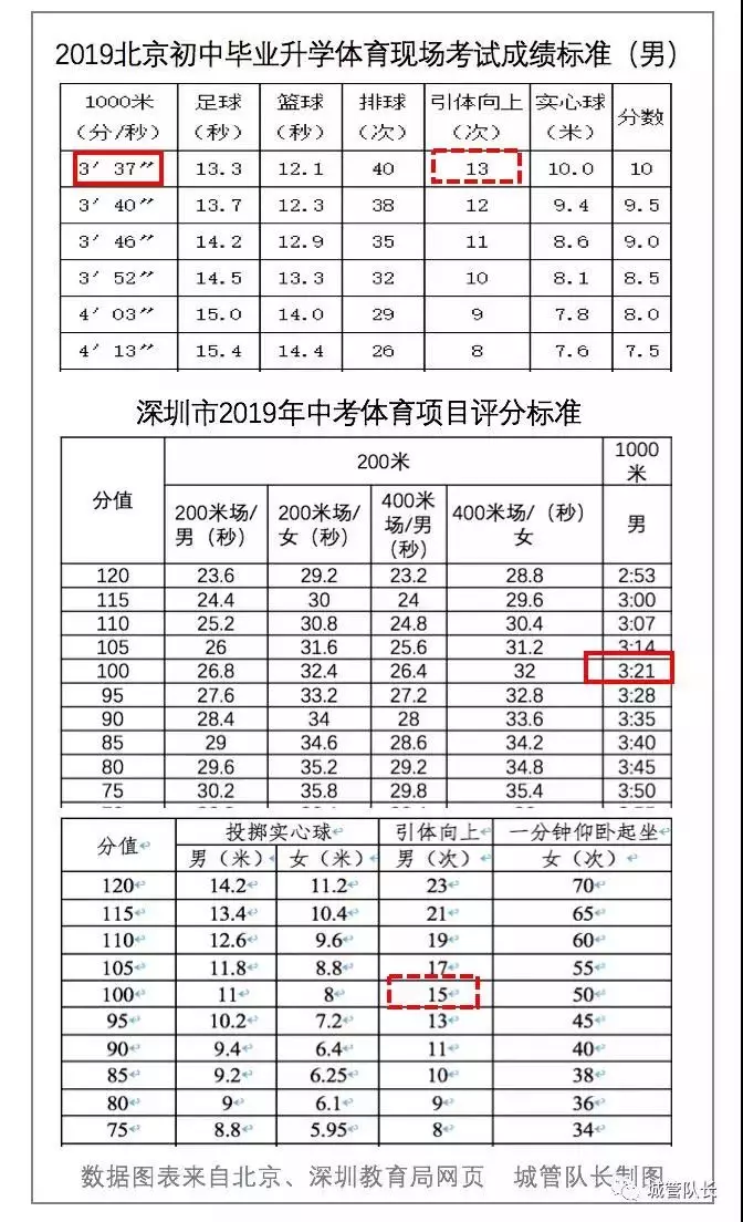 體育成績,男子1000米跑,北京滿分3分37秒,上海滿分3分34秒,廣州滿分3分45秒,而深圳滿分3分21秒,且深圳中考體育占總分比更高。意味著,如果后面跟著一只大老虎,深圳的孩子要比北京的孩子跑快16秒才能不被老虎吃掉。其他項目基本上對深圳的孩子要求更高,比如引體向上,深圳孩子滿分15個,北京孩子滿分13個,上海孩子滿分11個。網友:憑什么咱的力氣要更大……