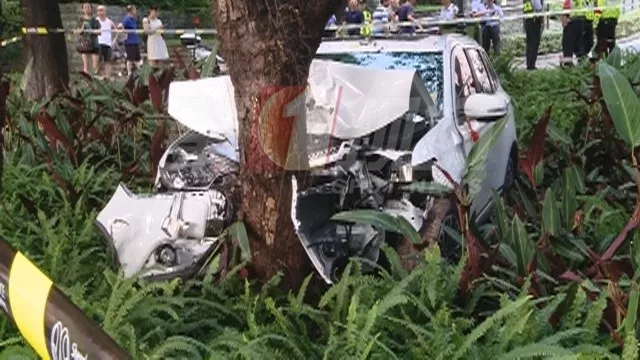 據(jù)現(xiàn)場目擊者稱當時車輛直接碾過人行綠道并撞飛了兩個小孩,最終車頭撞向荷花塘邊的一棵大樹才停住,如果不是這棵大樹阻擋,這輛車很有可能會沖向荷花塘里。