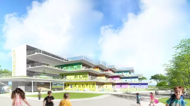 深圳市蓮花二村幼兒園重建校舍在緊張的用地中,首先退讓出一個完整的室外活動場地。通過立體剪裁出層層退臺的多元化的活動空間。南側向陽,北側遮雨,陰晴雨雪皆有孩子們的游樂天地。