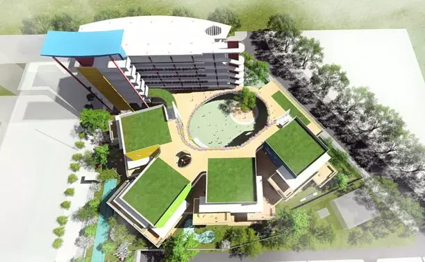 退距和滿足日照是首要解決的兩大問題。項目與周邊多層住宅距離較近,在被3小時日照線及周邊建筑最近點的18米范圍線切割的用地上布置幼兒生活用房,同時保證主要的幼兒生活用房(即班級活動單元)滿足日照情況下,自然形成了扭動的班級活動單元,借這個扭動形成了本案的設計理念:(糖果盒子、愛與信念)。建筑造型反映新、奇、趣、美的建筑個性風格。