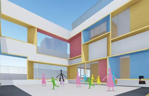 項(xiàng)目用地緊張且形狀不規(guī)則,與周邊建筑距離較近。在被3小時(shí)日照線及周邊建筑最近點(diǎn)的18米范圍線切割的用地上布置幼兒生活用房,同時(shí)保證主要的幼兒生活用房(即班級(jí)活動(dòng)單元)南向采光。在滿足功能需求的前提下,首層最大范圍的架空,并與室外活動(dòng)場(chǎng)地、綠地形成一體,南北連通,為幼兒提供開(kāi)敞的室外活動(dòng)空間。